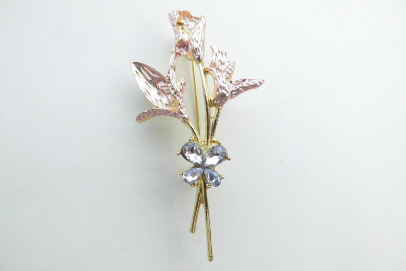 Broche licht roze bloemen met licht blauwe vlinder.lengte 6.1 cm x breedte 3.1 cm