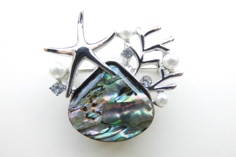 Broche zeester parelmoer met synth. parels.lengte 4 cm x breedte 4 cm